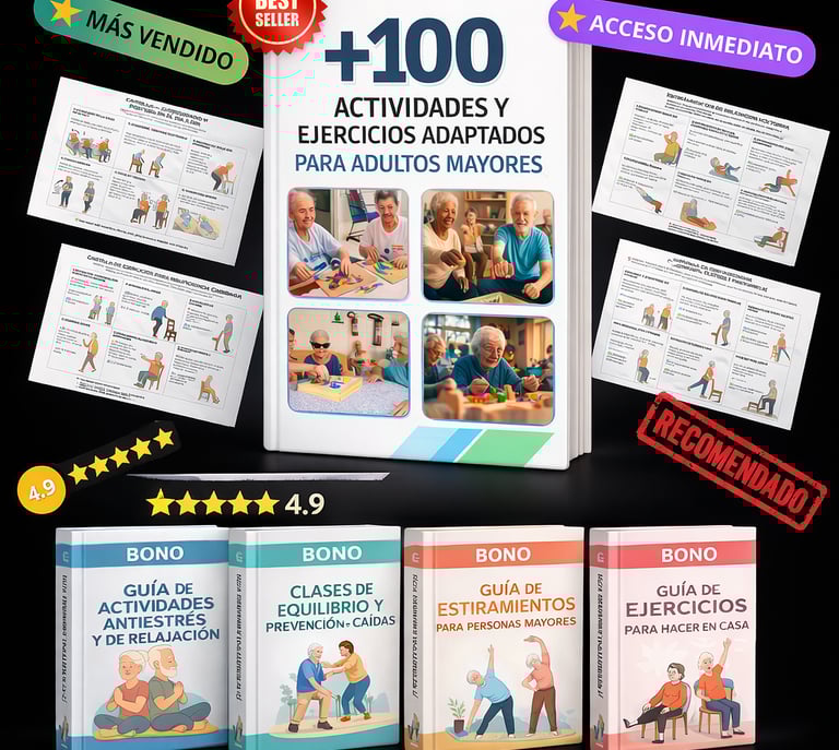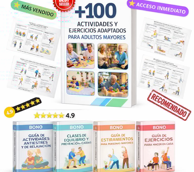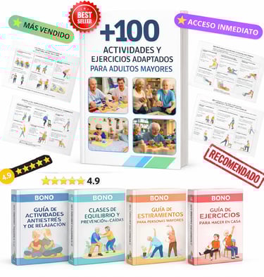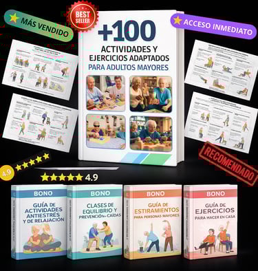 Al adquirir 100 ACTIVIDADES Y EJERCICIOS ADAPTADOS PARA ADULTOS MAYORES hoy, recibirás totalmente GRATIS estos 4 regalos exclusivos que complementarán tu evolución: